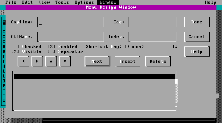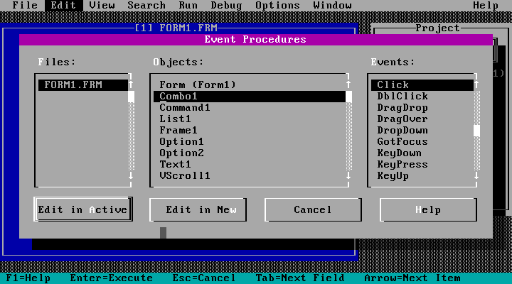 VBDOS had an innovative (and still unmatched) text-mode IDE built with the same windows and controls which could be used in programs built with it. The image above shows its Form Mode, where application interfaces could be created. They were saved to files with a .FRM extension. Back to the IDE's Code Mode, it was possible to "attach" event handling subroutines to each of the interface's controls.